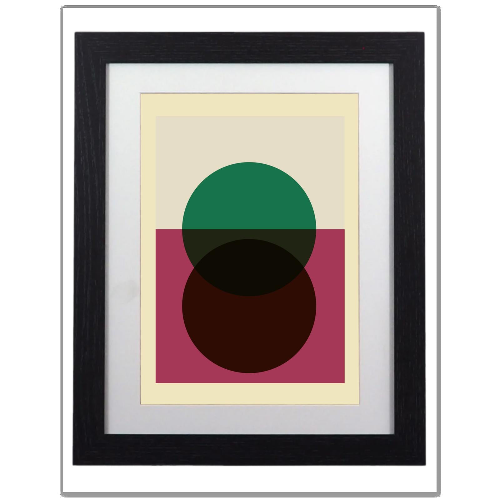 Transform your living space with our captivating Abstract Geometric Circles Framed Art Print. Inspired by the clean lines and vibrant palettes of the Bauhaus movement, this piece features intersecting circular forms in striking shades of green and deep magenta, set against a calming cream and pale yellow backdrop. It's designed to add a touch of sophisticated, modern elegance and visual intrigue to any wall, making it a perfect focal point or a harmonious addition to a gallery wall. This Essentials Template art print is more than just decor; it's a conversation starter.